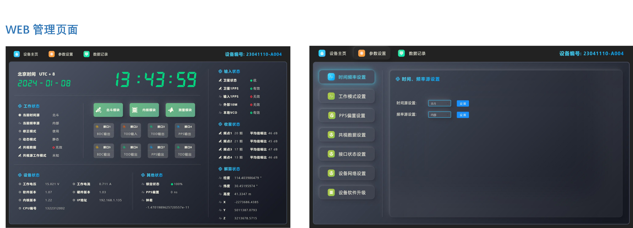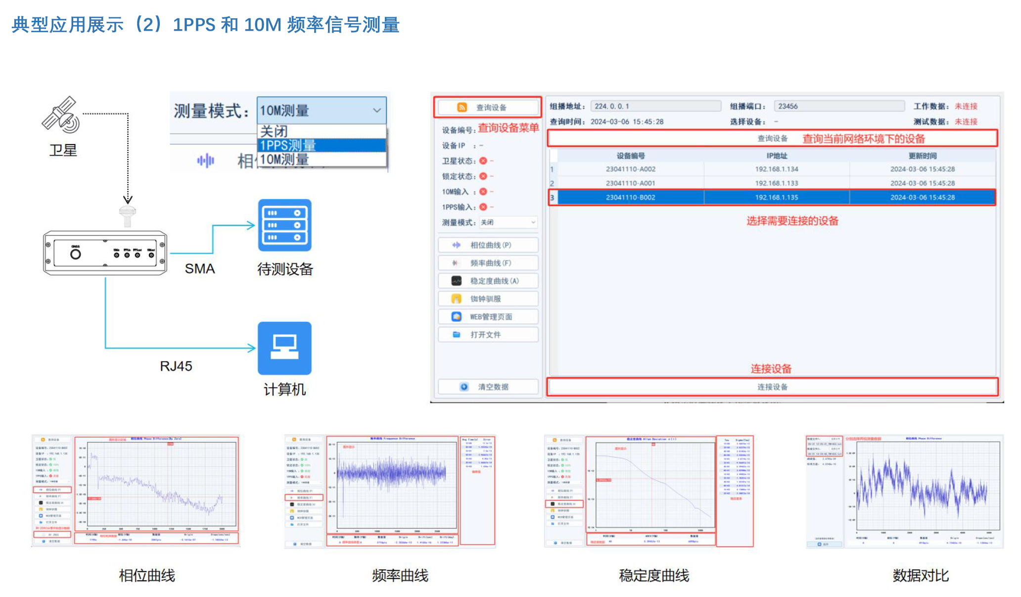 可同时输出1PPS、1PPS_TOD、B码、NTP时间信号;可测量1PPS、10MHz相位、频率、稳定度并曲线形成数据对比。结构设计:轻量化、小型化、可动态模式使用。可通过网络和串口实时输出设备状态信息,也可通过WEB页面查看状态信息、设置模块参数、查看模块日志、采集原始数据和固件升级等。